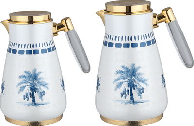 طقم ترامس الواحة السيف غاليري، 0.75 / 1 لتر، 2 قطعة، حافظة داخلية زجاج، هيكل خارجي أستيل، ضغاط، يد شفاف - أبيض لؤلؤي أزرق